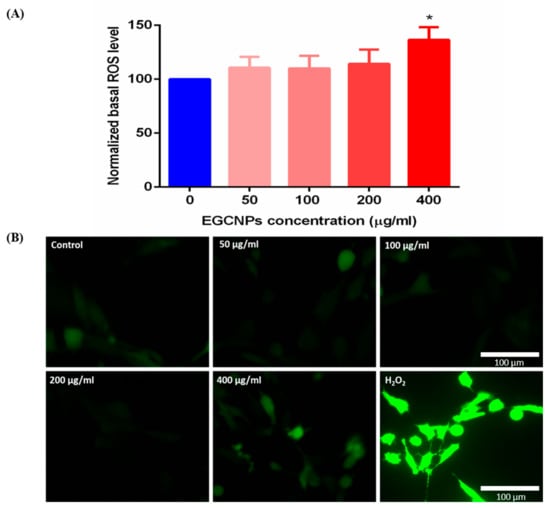 Overproduction of reactive oxygen species (ROS) is one of the most common pathways involved in nanomaterial toxicity [14]. Therefore, the basal ROS level in HLECs was measured after 24 h exposure to different EGCNPs concentrations (0, 50, 100, 200, and 400 µg mL−1) using the H2DCFDA probe. H2DCFDA is a non-fluorescent cell-permeable probe which is cellularly retained upon internalization due to deacetylation, and then oxidized by the action of ROS into highly fluorescent DCF enabling the estimation of ROS levels. As shown in Figure 2, EGCNPs concentrations up to 200 µg mL−1 did not lead to any significant alteration to the basal ROS level when compared to control cells (p > 0.05). Conversely, when the concentration was increased to 400 µg mL−1, a significant elevation in ROS level was observed.