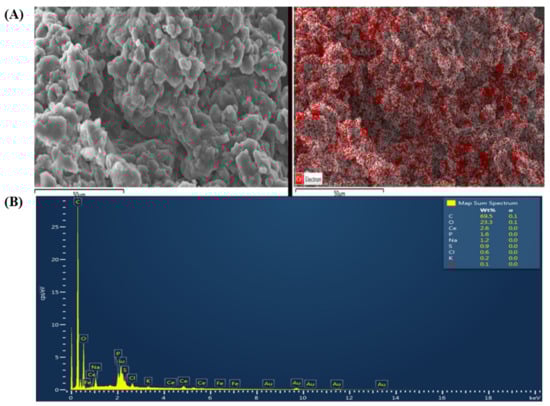 (A) SEM micrograph of the mitochondria isolated from HLECs treated with EGCNPs (left) and its associated cerium EDX mapping (right), (B) EDX spectrum and semiquantitative full elemental analysis generated from EDX mapping of the mitochondria. The presence of gold (Au) is due to sample coating with gold. Scale bar = 50 µm.
