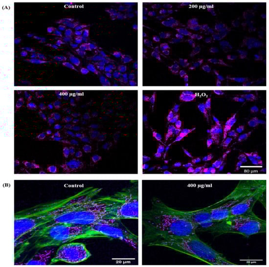 To examine the effect of EGCNPs on the mitochondrial morphology and network organization, staining with the mitochondria-selective stain (Mitotracker™ Red CMXRos) was employed. The mitochondria were uniform in shape and organization when treated with EGCNPs concentrations of up to 400 µg mL−1 and showed no significant difference from control cells (Figure 4A). The mitochondria were short and rod-shaped with organized localization in the perinuclear region (Figure 4B). H2O2 (positive control) caused significant mitochondrial aggregation and diffusion of the mitochondrial network was observed.