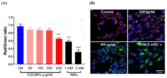 The integrity of the mitochondrial membrane potential is one of the most critical factors in assessing the function of the mitochondria; its depolarization (loss of normal charge distribution on both sides of the membrane) is an indicator for early stage apoptosis [25,26,27]. JC-1 dye was used to differentiate between healthy and depolarized mitochondria based on the change in the fluorescence of the dye. In healthy mitochondria, the cationic dye accumulates into the negatively charged interior of mitochondria where it forms J-aggregates shifting the fluorescence from green to red. Consequently, decreased red/green ratio is an indicator for mitochondrial membrane depolarization [28]. This ratio is highly accurate as it reports on changes in membrane potential regardless of the shape, size or density of the mitochondria [28]. As shown in Figure 5, EGCNPs concentrations up to 200 µg mL−1 had no significant effect on the (∆Ψm). When the concentration was increased to 400 µg mL−1, significant depolarization was observed suggesting that early stage apoptosis was taking place. For comparison, two different concentrations of sodium azide (NaN3) were used as positive controls since it is known to induce mitochondrial depolarization by blocking complex IV in the mitochondrial electron transport chain [28].