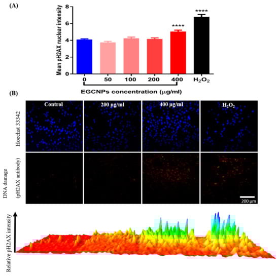 DNA integrity in HLECs is particularly important as its damage could lead to impaired protein synthesis, impaired differentiation and consequently cataract formation [31]. Since DNA is a common target of ROS [32], EGCNP induced genotoxicity was evaluated by detecting DNA double strands breaks (DSBs). As a response to DSBs, the histone protein H2AX is phosphorylated (pH2AX) and this can be detected with immunocytochemistry. The results in Figure 7 show that increased ROS was accompanied with increased DNA damage at 400 µg mL−1 whereas, at low concentrations, no genotoxicity was observed.