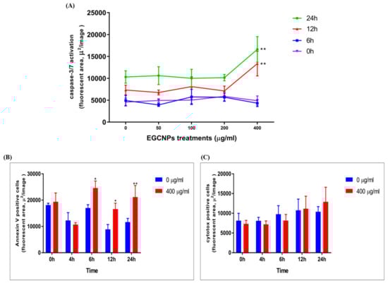 Activation of caspases is a key indicator of cells irrevocably submitting to apoptotic death [33]. The activation of caspases 3 and 7 (effector caspases in mammals) in HLECs upon EGCNPs treatment was detected over 24 h by means of live cell imaging using the IncuCyte® Caspase-3/7 Red apoptosis assay reagent. The reagent consists of a red fluorophore (NucView™633) attached to an activated caspase recognition motif (DEVD). Upon binding with activated caspases, the motif is cleaved, and the fluorophore that is liberated intercalates with DNA giving red fluorescence proportional to caspase activity that can be quantified over time. Figure 8A shows that EGCNPs do not result in significant caspase activation up to concentrations of 200 µg mL−1 compared to control cells. Overexposure to EGCNPs (400 µg mL−1) caused significant caspase activation as early as 12 h from the treatment commencing. This agrees with the JC-1 data (Figure 5) where loss of membrane potential was observed only at 400 µg mL−1.