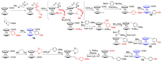 - Iftime, G.; Moreau-Bossuet, C.; Manoury, E.; Balavoine, G.G.A. Selective functionalization of the 1′-position of ferrocenecarbaldehyde. Chem. Commun. 1996, 527–528. [Google Scholar] [CrossRef]