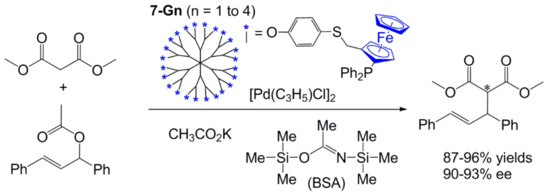 - Routaboul, L.; Vincendeau, S.; Turrin, C.O.; Caminade, A.M.; Majoral, J.P.; Daran, J.C.; Manoury, E. New phosphorus dendrimers with chiral ferrocenyl phosphine-thioether ligands on the periphery for asymmetric catalysis. J. Organomet. Chem. 2007, 692, 1064–1073. [Google Scholar] [CrossRef]