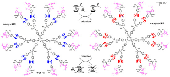 - Neumann, P.; Dib, H.; Caminade, A.M.; Hey-Hawkins, E. Redox Control of a Dendritic Ferrocenyl-Based Homogeneous Catalyst. Angew. Chem. Int. Ed. 2015, 54, 311–314. [Google Scholar] [CrossRef] [PubMed]