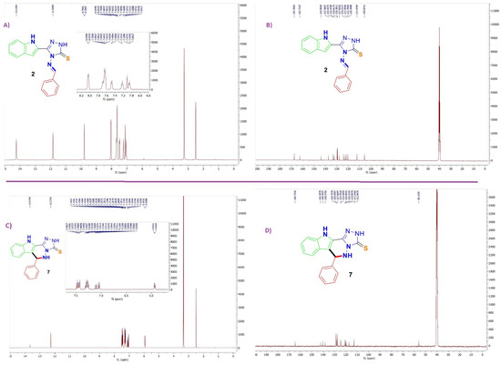 The Schiff base structures 2–6 were assigned from their spectra, which showed the following: The aromatic protons appeared in the range from 7.01 to 8.03 ppm, the benzylidene CH proton appeared as singlet around 9.73 ppm, and two D2O exchangeable signals were assigned for indole NH near 11.90 ppm, and the second for triazole NH that found around 14.30 ppm. The 13C-NMR showed only aromatic and thiocarbonyl signals (C=S) between 105.0 and 167.0 ppm (Figure 2A,B). There was exclusive formation of indolo-triazolo-pyridazinethiones 7–16 whereas, indolo-triazolo-thiadiazole 17 and indolo-triazolo-triazine 18 did not occur. The structures assignments were deduced from the 1H-NMR, which showed the appearance of pyridazine CH proton as a doublet around 5.92 ppm; then, the aromatic protons and three D2O exchangeable signals around 7.01, 12.24, and 13.64 ppm assigned for pyridazine NH, indole NH, and triazole NH protons, respectively, appeared. 13C-NMR displayed the pyridazine CH at 56.13 ppm and the thiocarbonyl signal (C=S) around 164.73 ppm (Figure 2C,D). In addition, the disappearance of one CH from the indole signals strongly implied the indolo-triazolo-pyridazinethiones 7–16 structures. Structure 17 was excluded because it should contain the indole CH and should not contain any thiocarbonyl signal. Structure 18 was also excluded because our structures contain the indole NH. The 1H-NMR of derivatives 19–25 displayed the methylene protons around 5.00 ppm, and the CH of the pyridazine ring was detected at 5.92 ppm. Moreover, two exchangeable protons were detected at 7.00 ppm for NH pyridazine and 12.36 ppm for the NH indole. 13C-NMR demonstrated the methylene carbons around 35.10 ppm, and no carbons were detected near to 160.00 ppm. The results support the idea that the alkylation of bis(bromomethyl)quinoxaline was performed with sulfur rather than nitrogen.