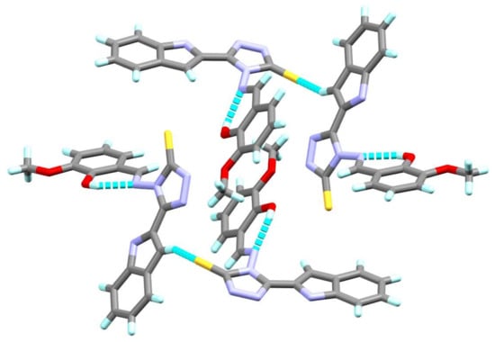 The structure of 6 was determined by single crystal X-ray diffraction (Figure 3). Compound 6 crystallized in a triclinic system and P-1 space group with Z = 2 and two molecular formula per asymmetric unit (Table 1 and Table 2). For simplicity, one of the two-formula units with atom numbering is shown in Figure 3. The lists of the bond distances and angles are collected in Tables S1 and S2 (Supplementary data). The indole moiety is typically a planar system in which the plane passes through the triazole-3-thione, and the aryl moieties are twisted from the plane of the indole plane by 8.91° and 52.82°, respectively, for the molecular unit shown in Figure 4. The other molecular unit with higher atom numbering showed similar twists of 6.60° and 52.98°, respectively [36,37,38].