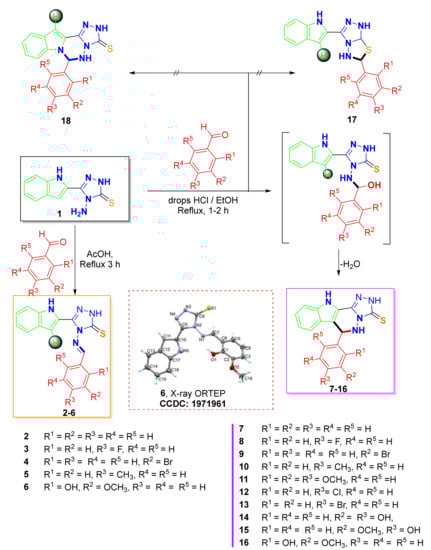 The condensation of 4-amino-5-(1H-indol-2-yl)-2,4-dihydro-3H-1,2,4-triazole-3-thione 1 with benzaldehyde, 4-fluorobenzaldehyde, 3-bromobenzaldehyde, p-tolualdehyde, and o-vanillin in glacial acetic acid yielded the Schiff bases 2–6 in low yield. Alternatively, we carried out the reaction using a stronger acidic medium of concentrated HCl in ethanol under a reflux condition. Surprisingly, this reaction condition exclusively yielded the cyclized compounds indolo-triazolo-pyridazinethiones 7–16 in excellent yields. The approach was further extended for the substrate scope, and the reaction was performed with ten aromatic aldehydes with different electronic effects: benzaldehyde, 4-fluorobenzaldehyde, 3-bromobenzaldehyde, p-tolualdehyde, 2,3,4-trimethoxybenzaldehyde, 4-chlorobenzaldehyde, 4-bromobenzaldehyde, 3,4-dihydroxybenzaldehyde, 4-hydroxy-3-methoxybenzaldehyde, and 2-hydroxy-3-methoxybenzaldehyde (Scheme 1). Compounds 17 and 18 did not occur under the reaction condition.