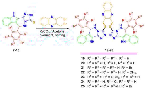 The coupling of indolo-triazolo-pyridazinethiones 7–13 with 2,3-bis(bromomethyl)quinoxaline in acetone and K2CO3 yielded 2,3-bis((5,6-dihydro-14H-indolo[2,3-d]-6-aryl-[1,2,4-triazolo][4,3-b]pyridazin-3-ylsulfanyl)methyl)quinoxalines 19–25 in excellent yields (Scheme 2).