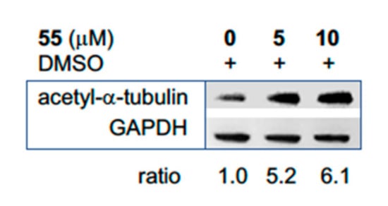 Determination of α-tubulin acetylation in NCI-H460 cells by western blot following 18 h treatment with 55. GAPDH used as loading control.