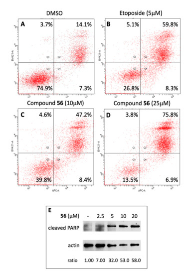 Induction of apoptosis upon treatment of OCI cells with 56. (A–D) Annexin V staining, (E) PARP cleavage. (A) Control cells treated with DMSO; (B) Cells treated with etoposide (5 µM); (C) Cells treated with 10 μM 56; (D) Cells treated with 25 µM 56; Apoptotic cells appear in the upper right-hand quadrant (A–D) (E) Induction of PARP cleavage (normalized ratio = cleaved PARP/actin).