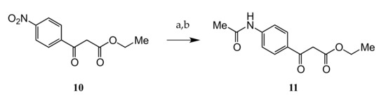 While most β-keto esters were obtained from commercial sources, compound 11 was prepared in two steps from nitrobenzoyl propionate ester 10. Iron-mediated reduction of the nitro group first gave the corresponding aniline in good yield. In the subsequent step, acetylation of the aniline furnished the desired compound 11(see Supplementary Materials).