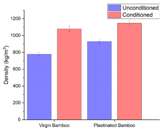 Density of virgin and plastinated bamboo, before and after moisture conditioning.