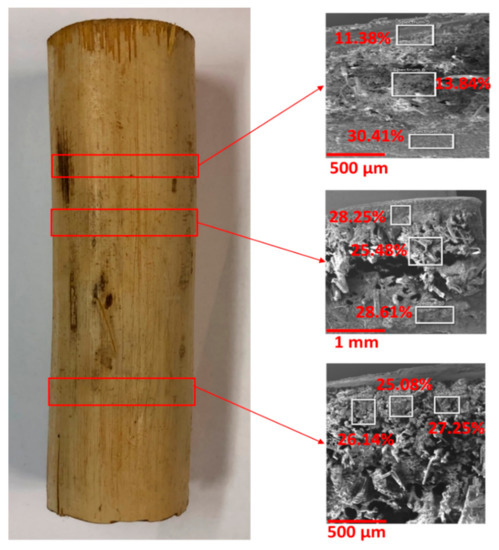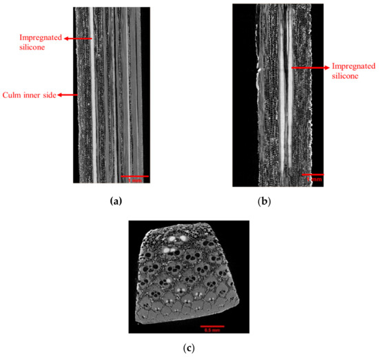 The density, microstructure, and chemical composition of the plastinated bamboo were characterized to evaluate the effect of plastination on the physical parameters of bamboo. Micro-tomography was used to visualize the internal structure of plastinated bamboo and to study the extent and interaction of impregnated silicone with the bamboo cellular structure. The density of the unconditioned (dry) and moistened (conditioned, water immersed) plastinated and virgin bamboo samples was calculated to understand how plastination affected the moisture absorption (mass change) and swelling (volume change) in bamboo fibres. To the best of our knowledge, no prior studies investigated the content of silicone that flows into the plastinated sample. Energy dispersive x-ray spectroscopy (EDS) (Oxford Instruments NanoAnalysis, Concord, MA, USA) was conducted on different cross-sections of a plastinated bamboo culm to calculate the amount of silicone flowing into the bamboo. The cross-sections of the bamboo samples were coated with a platinum layer to enable conduction of electrical current [22]. The platinum sputtering thickness was about 6e-6 to 8e-6 m. A Tescan Mira 3 XMU Scanning Electron Microscope was used for the visual investigations. Also for X-ray micro-CT, a Zeiss/Xradia X-400 (ZEISS Xradia 400, Concord, CA, USA), was used. The X-ray source voltage was set to 40 kV with a current of 250 µA. All the micro-CT slices have the spatial resolution of 3.172 µm. No optical filter was used during the scanning process and the 360-degree rotation scan had a step size of 0.144 degrees. Reconstruction software XMReconstructor (V. 8.1, Zeiss/Xradia, Concord, CA, USA) was used to obtain a set of equally spaced 2D images. The resulting slices were then reconstructed into a 3D tomographic image of the sample.