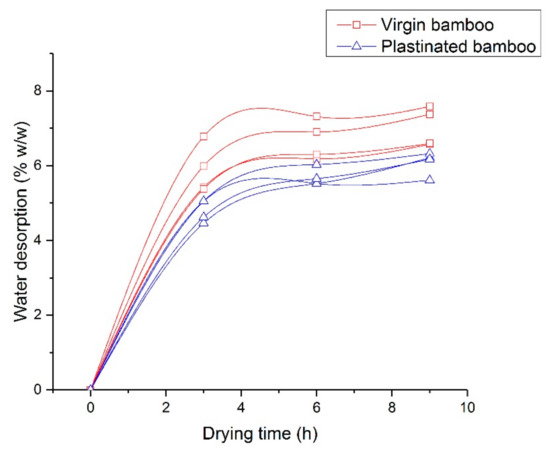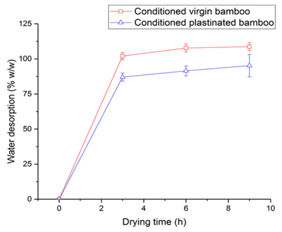 Weight fraction of water desorbed by conditioned virgin and conditioned plastinated bamboo vs. drying time in the oven, showing lower moisture absorbed by plastinated bamboo.