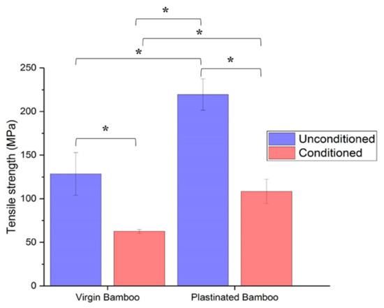 Tensile strength of virgin and plastinated bamboo, before and after moisture conditioning. * indicates a significance level with p-value < 0.05.