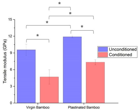 Tensile modulus of virgin and plastinated bamboo before and after moisture conditioning. * indicates a significance level with p-value < 0.05.