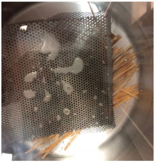A room temperature impregnation process was followed in this study in which a high boiling point and low vapour pressure mixture was impregnated into the cells of the specimen by vaporizing the low boiling point and high vapour pressure acetone. To achieve this impregnation level, the dehydrated samples from the acetone bath were quickly immersed into the silicone mixture. These samples were kept immersed in the silicon mixture overnight to achieve an equilibrium between the concentrations of the acetone and silicone mixture. On the second day, the pressure chamber was sealed and pressure reduction inside the chamber was performed using a vacuum pump through a catch pot. Initially, the pressure was decreased to 0.045 m Hg and bubble formation was observed as the pressure decreased, as shown in Figure 9. The mixture was then allowed to withstand this pressure until no bubbles were observed on the surface.