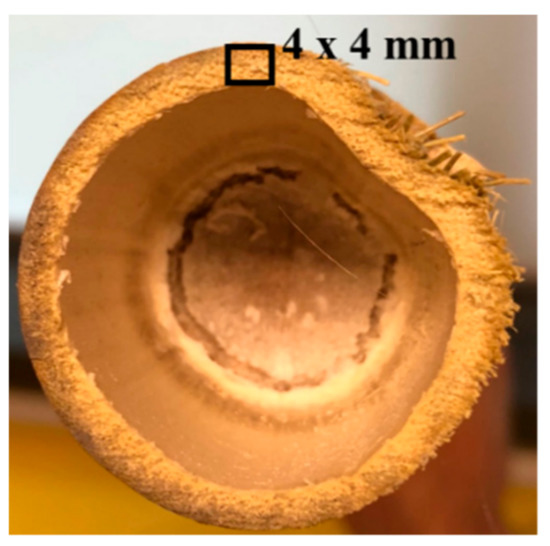 Due to the lack of test codes for the tensile testing of bamboo, a customized sample geometry was developed, with the remaining test guidelines derived from ASTM D4761 (ASTM International, West Conshohocken, PA 19428, USA). This involved 4 × 4-mm sections of bamboo being extracted from the bamboo culm, with height equal to the maximum length of culm, about 120 mm (mostly uniform in all samples), as shown in Figure 11. The tensile strength parameters were then derived using the load-displacement curve generated during the tests. For this test, six replicates for each of the plastinated and virgin bamboo strips were tested.