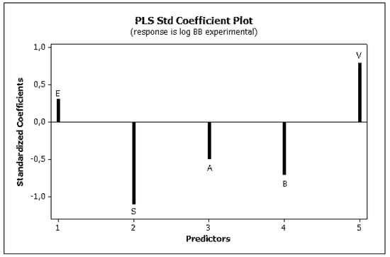 Irrelevant cross correlations between the descriptors were observed; the values of R2 between pairs of descriptors were E/S 0.66, E/A 0.01, E/B 0.25, E/V 0.60, S/A 0.06, S/B 0.69, S/V 0.72, A/B 0.20, A/V 0.05 and B/V 0.49. This is an important information indicating that there are no significant inter-correlations of structural descriptors, i.e., E, S, A, B and V. On this basis, we can conclude that non-physical factors do not affect the parameters of Equation (10). The reliability and predictive potency of the model expressed by Equation (10) were estimated by leave-one-out (LOO) cross validation and the parameters that were obtained are presented in Table 4. Figure 1 shows the standardized coefficients for particular descriptors and it confirms the well-known qualitative relationships: compound polarity, i.e., dipolarity/polarizability, hydrogen bond acidity and hydrogen bond basicity expressed by S, A and B values, respectively, decreases the BBB permeation, while the compound size measured by the McGovan volume (V) as well as the excess molar refraction E (in a minor degree) contribute to increase of log BB values [41]. The PLS response plot is presented in Figure 2, which shows the linear regression between the predicted (calculated response) and experimental log BB values of the 23 compounds from Table 3. The residual versus leverage plot in Figure 3 proves that the model that was obtained is valid for the domain in which it was developed [44]. The warning leverage limit (h*) was calculated according to: