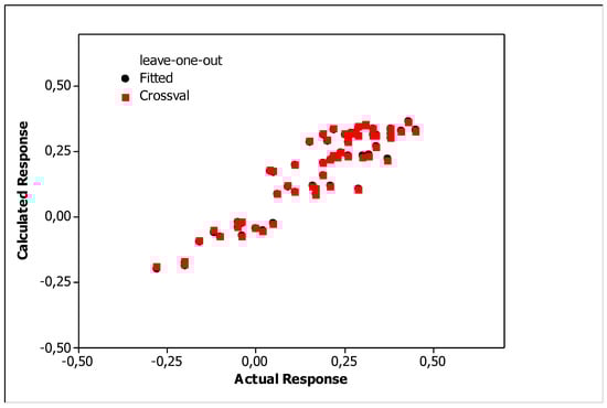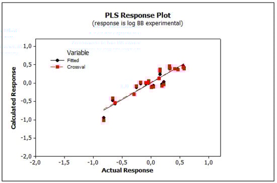 The relationships showed that molecular polarizability and lipophilicity promote increases in the log BB, while polar surface area decreased the ability of a substance to cross the BBB. The correlations between the log BB values calculated according to the LFER model (Equation (10)) and the optimized QSARs models, i.e., by Equations (12)–(14) are presented in Figure 5, Figure 6 and Figure 7, which shows the response plots obtained by PLS for particular stationary phases.
