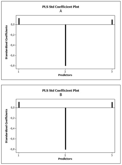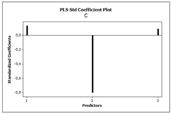 PLS standardized coefficient plots obtained for Equation (12) (A), Equation (13) (B) and Equation (14) (C).