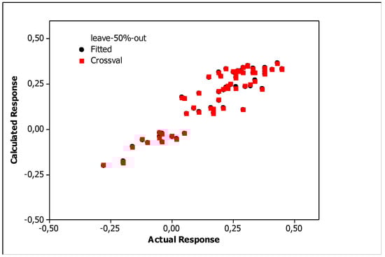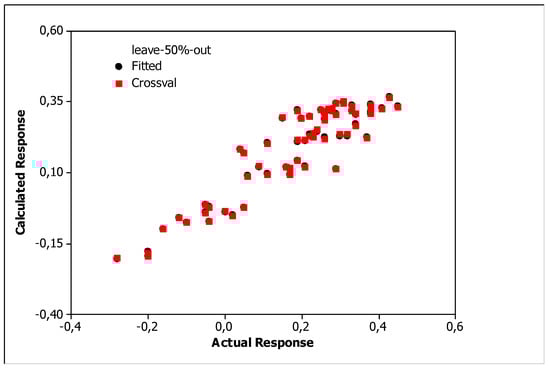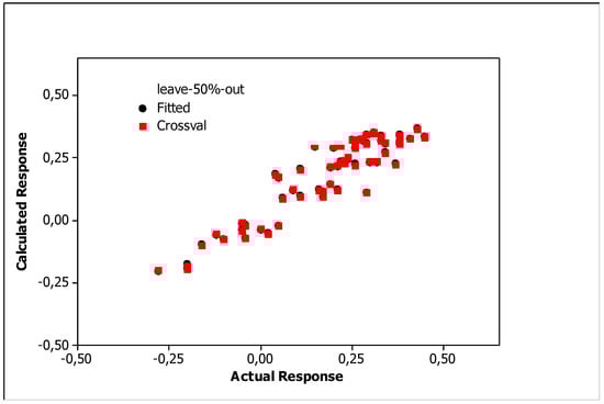 Statistical parameters of cross-validation of MLR models described by Equations (10), (12), (13) and (14); MSE—mean square error, MSEcv*—mean square error of leave-one-out cross validation, MSEcv**—mean square error of leave-50%-out cross validation, PRESS*—predicted residual sum of squares of leave-one-out cross validation, PRESS**—predicted residual sum of squares of leave-50%-out cross validation.