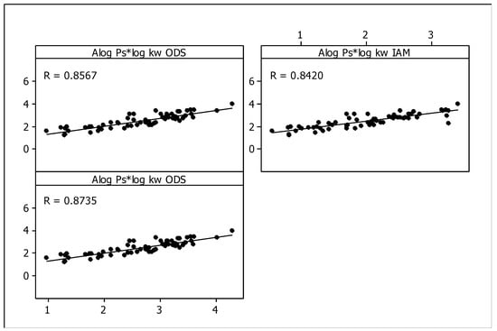 To assess the significance of chromatographic parameters, the lipophilicity descriptors, log kw were compared with partition coefficients in the n-octanol-water system, i.e., the log P values. The relationships between log P values calculated from molecular structures of the tested compounds and obtained by use of Alog Ps algorithm [67,68] and their chromatographic factors (i.e., log kw, ODS, log kw, IAM and log kw, Cholester, respectively) were established. Good linear correlations between these descriptors (R > 0.8), that are observed in Figure 8, confirmed that chromatographic parameters can be used as lipophilicity descriptors in case of the studied compounds (Figure 8).