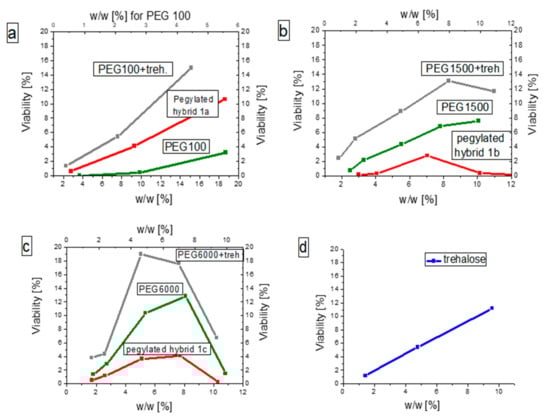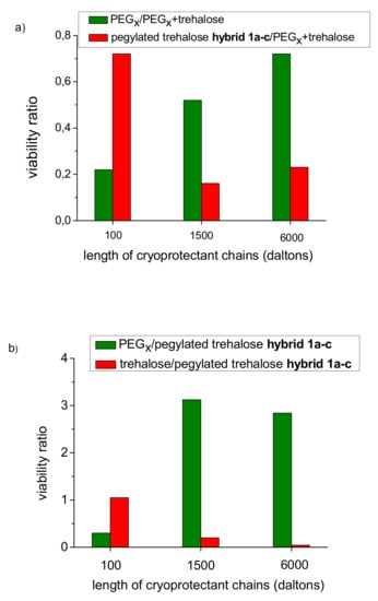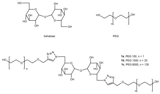 All mentioned compounds were tested at several concentrations. Importantly, the pegylated trehaloses 1a–c were measured at stoichiometric concentrations w1a = 18.6%, w1b = 5.7% and w1c = 5.1% to achieve comparable conditions of cryoprotection. For the same reason, the tested compounds PEGx, trehalose, and 1a–c were treated at corresponding molar ratio 2:1:1. We also used effective concentrations w1a = 18.6%, w1b = 8.6% and w1c = 7.7% at the highest viability response for those new materials (Figure 2).