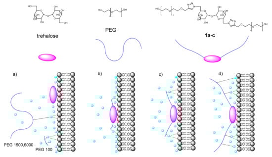 Proposal of chelate effect: (a) The proposed destabilization of polar lipid heads through hydrogen interactions of PEGs with membrane water [,] the interaction of polymer chains of PEG 1500 and PEG 6000 to the water which bound to membranes is weaker in comparison with short PEG 100. The assumed stabilizing effect of cell membranes by trehalose displacement with water; (b) The short pegylated linkage of 1a prevents a high destabilization of cell membrane; (c) Approaching middle PEG-chains to cell membrane increases the probability for stronger hydrogen interactions with water resulting in the destabilization of membrane at the concentration comparable with pegylated hybrids 1b; (d) the more flexible pegylated hybrid 1c may partially deflect its PEG-tentacles from the membrane surface.