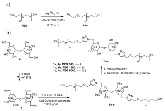 Synthesis of propragylated PEGs 4a–c (a) and pegylated trehalose derivatives 1a–c (b) [].