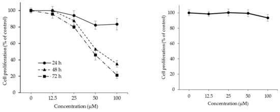 Anti-proliferative effects of OPD in SK-Hep-1 human hepatoma cells (left) and MRC5 human normal cell line (right). SK-Hep-1 cells were cultured in a 96-well plate and treated with the indicated concentrations of OPD for 24–72 h. MRC5 cells were cultured in a 96-well plate and treated with the indicated concentrations of OPD for 72 h. The cell proliferative activity was determined using the SRB assay. The % cell proliferation value was calculated by the mean absorbance of samples/absorbance of the vehicle-treated control as described in the Materials and Methods. Data are presented as the means ± S.E. (n = 3).