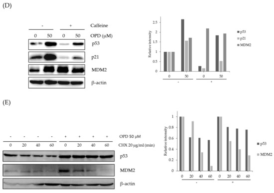 Effects of OPD on the regulation of p53-associated signaling pathways. (A) SK-Hep-1 cells were treated with the indicated concentrations of OPD for 24 h. The expression level of proteins was analyzed by western blot. β-Actin was used as an internal control. (B) SK-Hep-1 cells were treated with 50 μM OPD for various time points up to 48 h. The expression level of proteins was analyzed by western blot. β-Actin was used as an internal control. (C) SK-Hep-1 cells were treated with various concentrations of OPD for 24 h. After cells were harvested, the proteins were separated into cytosolic and nuclear fractions as described in the Materials and Methods. The protein expression levels were analyzed by western blot. β-Actin was used as an internal control. (D) SK-Hep-1 cells were pretreated for 2 h with 1 mM caffeine, and then cultured with 50 μM OPD for an additional 24 h. The expression level of proteins was analyzed by western blot. β-Actin was used as an internal control. (E) SK-Hep-1 cells were treated with 50 μM OPD for 24 h and then treated in the absence or presence of 20 μg/mL cycloheximide. The cells were harvested at 0, 20, 40, and 60 min. The expression level of proteins was analyzed by western blot, and the band density was quantified using the NIH ImageJ software (Bethesda, MD).