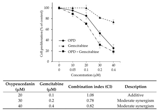 To further investigate the effect of the combination of OPD with an anticancer agent on the antiproliferative activity of hepatoma cells, we selected gemcitabine, a pyrimidine-based DNA synthesis inhibitor, as a candidate compound based on the use of patients with liver cancer in the clinic. As shown in Figure 6A, cotreatment with OPD and gemcitabine exhibited a synergistic effect (CI < 1.0) on the antiproliferative activity of SK-Hep-1 cells. The combination of the higher concentrations of OPD and gemcitabine showed a relatively stronger synergistic activity. In accordance, when OPD (20 μM) was treated with various concentrations of gemcitabine (0.1–0.4 μM), the combination with the higher concentration of gemcitabine (0.4 μM) was shown to have a stronger synergistic activity (Figure 6).