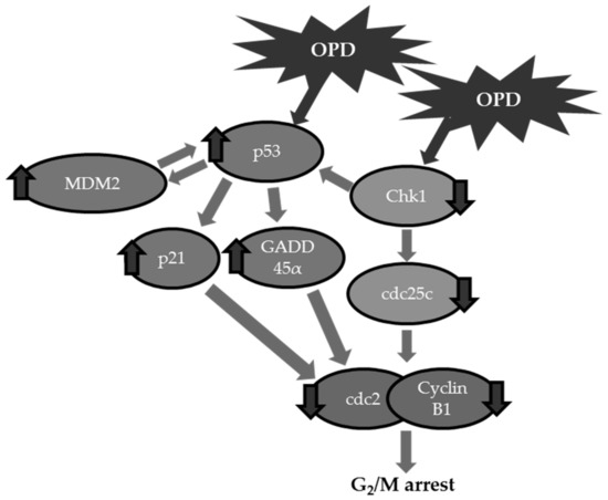It is known that the cell cycle is a finely controlled sequence of events in the growth and proliferation of eukaryotic cells. Cell cycle progression occurs in an ordered manner that is monitored by cell cycle checkpoints. Among the checkpoints, the DNA damage-induced G2/M checkpoint guarantees the fidelity of genomic stability. However, cancer cells have abnormally activated in cell division as a result of diverse factors, including uncontrolled checkpoint protein expression. These defects in the checkpoints lead to genomic instability, cell death, or carcinogenesis. Therefore, the regulation of the G2/M checkpoint is often applied as a potential therapeutic target to evaluate the efficacy of natural product-derived antitumor agents in cancer cells. In the present study, we found that OPD effectively inhibited the growth of SK-Hep-1 human hepatoma cells. Cell cycle distribution analysis also revealed that the antiproliferative activity of OPD is in part associated with the induction of G2/M cell cycle arrest in cells. This result was consistent with the previous report of G2/M phase arrest of OPD in prostate cancer cells [27]. However, a previous study of the antiproliferative activity of OPD on the prostate cancer cells did not investigate in detail the regulatory biomarkers involved in G2/M phase cell cycle arrest in cancer cells. The present study revealed that the induction of G2/M phase cell cycle arrest by OPD was correlated with the regulation of Chk1-mediated G2/M checkpoint proteins, including cdc25c/cdc2 and cdc2/cyclin B1 complex pathways, in hepatoma cells. Chk1 is considered to play an important role in the G2/M checkpoint via the ATM-RAD3-related (ATR) pathway. Chk1 also regulates the activity of its shared downstream substrate, cell division cycle 25c (cdc25c). OPD effectively modulates the Chk1-cdc25c activation pathway axis, leading to the induction of G2/M cell cycle arrest in SK-Hep-1 cells. We also found that OPD effectively suppressed the activity of cyclin B1 and its partner cell division cycle 2 (cdc2) expression, which in turn evokes the prevention of entry into the mitosis (M) phase cell cycle transition in hepatoma cells.
