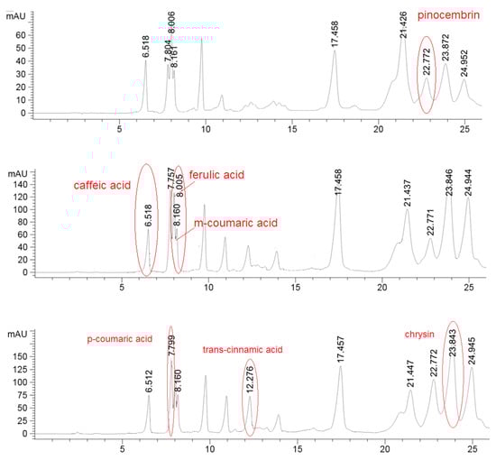 Detection of pinocembrin in one hills sample at 375 nm; detection of caffeic acid, ferulic acid and m-coumaric acid in one hills sample at 325 nm; detection of p-coumaric acid, trans-cinnamic acid and chrysin in one hills sample at 295 nm.