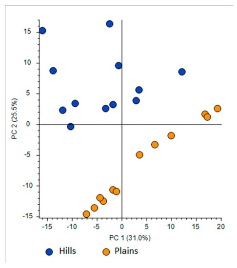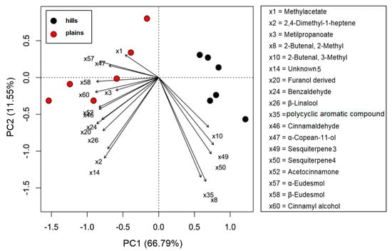 PCA biplot of volatile compounds (VOCs) of propolis samples collected in hills (Ligurian–Piedmont Apennines) and plains (Po Valley).