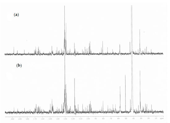 The NMR spectra of samples were recorded on a Bruker Avance (Santa Barbara, CA, USA) spectrometer with proton operating frequency 600.13 MHz with a 5mm TBI probe. The spectra were performed at 300 K using 16K of TD (time domain), acquisition time 1.27 min, delay time 1.0 s and the number of scans 48. Was used a spectral width of 12019 Hz. For 1H-NMR analysis 2–3 mg of crude extracts were dissolved in 0.6 mL of DMSO-d6, while for 13C-NMR spectra 10–20 mg for each sample were used.