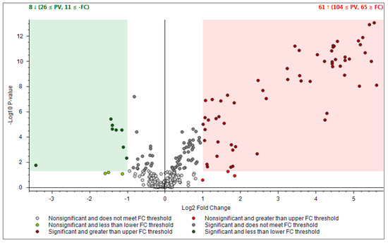 Figure 5. Differential analysis presented by Volcano Plot Model for the comparison between the relative intensity of chromatographic peak from two propolis groups. P-value (PV) was set on 0.05. Red region contains up-regulated signal where the quantities from Apennines was significantly higher than those found in Po Valley samples and was greater than the upper fold-change (FC) threshold. The green region comprises up-regulated peaks in Po Valley samples.