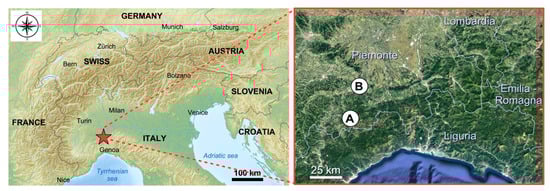 Localization of the two sampling areas: (A) hill (Ponzone); (B) plain (Visone).