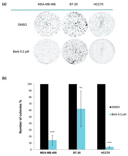 Chicago/Turabian StyleEl Khalki, Lamyae, Virginie Maire, Thierry Dubois, and Abdelmajid Zyad. 2020. "Berberine Impairs the Survival of Triple Negative Breast Cancer Cells: Cellular and Molecular Analyses" Molecules 25, no. 3: 506. https://doi.org/10.3390/molecules25030506