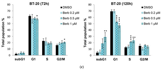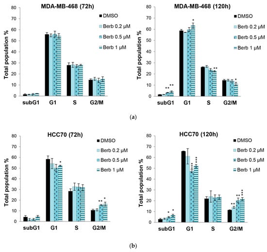 2.2. Berberine Differentially Affects TNBC Cell Cycle Progression