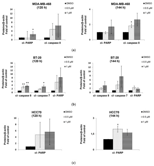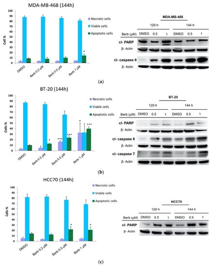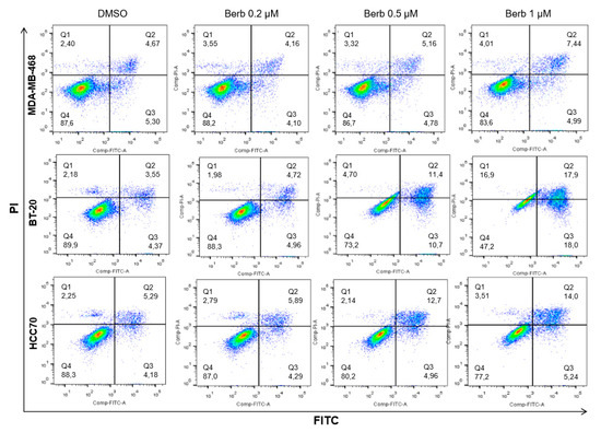 2.4. Berberine Induced Apoptosis on TNBC Cell Lines in a Dose and Time Dependent Manner