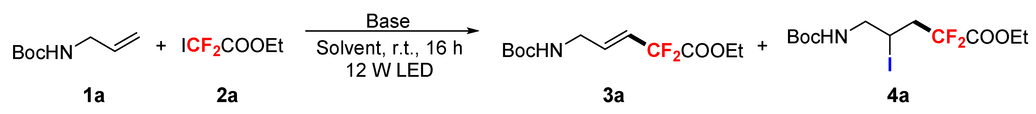 We initially probed this catalyst-free fluoroalkylation reaction by using readily available tert-butyl allylcarbamate 1a and ethyl iododifluoroacetate 2a (1.5 equiv) as model substrates. 29% yield of atom transfer radical addition (ATRA) product 4a was obtained when the reaction was performed with K3PO4 (2.0 equiv) in MeCN and irradiated by blue LEDs for 16 h. After a series of reaction media were screened (Table 1, entries 2–8), THF, Toluene and dioxane were not suitable for this transformation, and 10% yield of desired product was obtained when DMSO was used as solvent. Both 3a and 4a were obtained when DMA and DMF were used. To improve the selectivity of this transformation, a variety of different bases were examined utilizing DMA as solvent for this reaction (Table 1, entries 8–11). Among them, KOAc was the best choice and afforded 3a in 64% yield (Table 1, entry 11). Finally, different light sources were tested, the yield increased to 95% when the reaction mixtures were irradiated under purple LEDs (Table 1, entry 13), no desired product was observed when control experiments were carried out in the absence of light or base, demonstrating the photochemical nature of this transformation (Table 1, entries 14, 15).