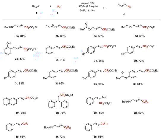 Atom Transfer Radical Addition−Elimination (ATRE) reaction for the synthesis of fluoroalkylated alkenes a,b. a Reaction conditions (unless otherwise specified): 1 (0.3 mmol, 1.0 equiv), 2 (0.45 mmol, 1.5 equiv), KOAc (0.6 mmol, 2.0 equiv) in anhydrous DMA (2.0 mL), r.t. under Ar, purple LEDs, for 16 h. b Yield of isolated product.