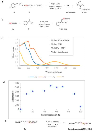 To gain insight into the mechanism of this reaction, several experiments were performed. The reaction was completely suppressed when a radical scavenger TEMPO (1.0 equiv) was added as an additive under the standard reaction conditions (Scheme 2a). Furthermore, a radical clock experiment was conducted. The ring-expanded product 7 was formed when 2a was treated with α-cyclopropylstyrene (6) in the absence of 1a (Scheme 2b). Optical absorption spectra of the reactants found that the absorption was obvious strengthened when DMA and RFI were mixed (Scheme 2c, for details, see Supplementary Materials), which indicated a non-covalent interaction occurred between them. Moreover, this conclusion was further confirmed by a Job’s plot (Scheme 2d, for details, see Supplementary Materials). Finally, compound 4a was totally converted to 3a under optimized condition in the dark (Scheme 2e, for details, see Supplementary Materials). This result indicated that the reaction was performed via atom transfer radical addition elimination pathway.