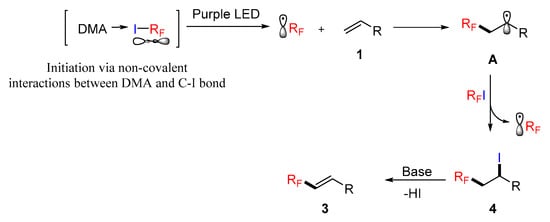 Based on these preliminary results and previous reports [53,54], a plausible mechanism was depicted in Scheme 3. Initially, non-covalent interactions occurred between DMA and C–I bond. Then fluoroalkyl radical was generated under the irradition of purple LEDs. Subsequently, fluoroalkyl radical reacted with alkenes (1) and generated a carbon radical A, which abstracted an iodine atom from RFI to afford ATRA product 4 along with RF radical that sustains the chain. Finally, elimination of 4 with base could afford the corresponding fluoroalkylated-ATRE products (3).