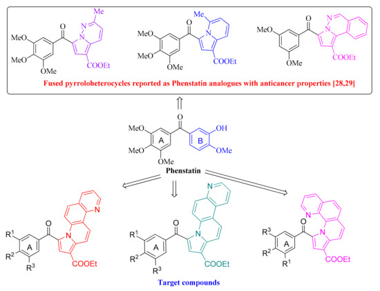 Encouraged by the above considerations (especially by the cytotoxic properties of the reported fused phenathrolines) and as part of our ongoing research aimed at investigating new anticancer drugs [15,16,28], we designed a new series of phenstatin analogues by replacing the 3-hydroxy-4-methoxyphenyl ring of phenstatin (ring B) with three different classes of substituted pyrrolophenanthrolines (Figure 1).