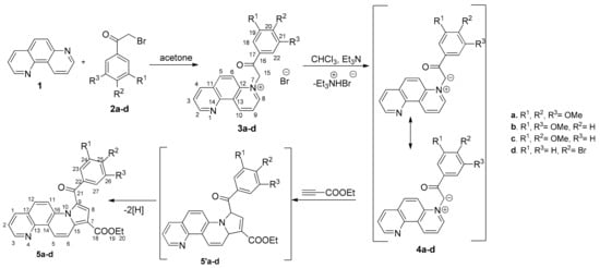Compounds 5a–d were successfully synthesized using a two-step procedure starting from 1,7-phenanthroline 1. The first step comprised the formation of monoquaternary 1,7-phenanthrolin-7-ium salts 3a–d by the nucleophilic substitution of phenanthroline 1 to 2-bromoacetophenones 2a–d (Compounds 2b, 2c and 2d were obtained using reported procedures [30]).
