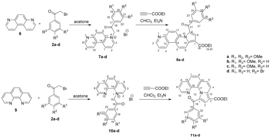 We employed a similar strategy in the synthesis of pyrrolo[2,1-c][4,7]phenanthrolines 8a–d and pyrrolo[1,2-a][1,10]phenanthrolines 11a–d, by reacting phenanthrolinium monoylides (derived from 4,7- and 1,10-phenanthrolinium salts 7a–d and 10a–d, respectively) with ethyl propiolate (Scheme 2).
